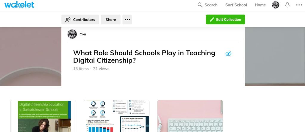 From there I took the suggestions of many of my classmates and began to compile information, specifically that of educators in the EdTech world, and the opinions that they held regarding the Teaching of Digital Citizenship Education in Schools. Too keep all of this organized I tried out a new tool I noticed that Alec had recommended to Sarah on her blog – Wakelet. I found this particularly helpful in creating the video since I had many pages of notes and quotes to include and wanted to make sure to include references in the video itself. which made it easier to copy and paste the correct information into the project and credit the authors of each work.