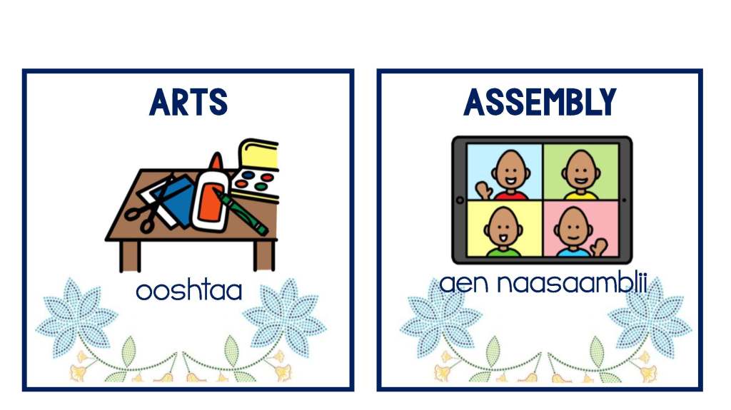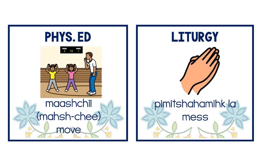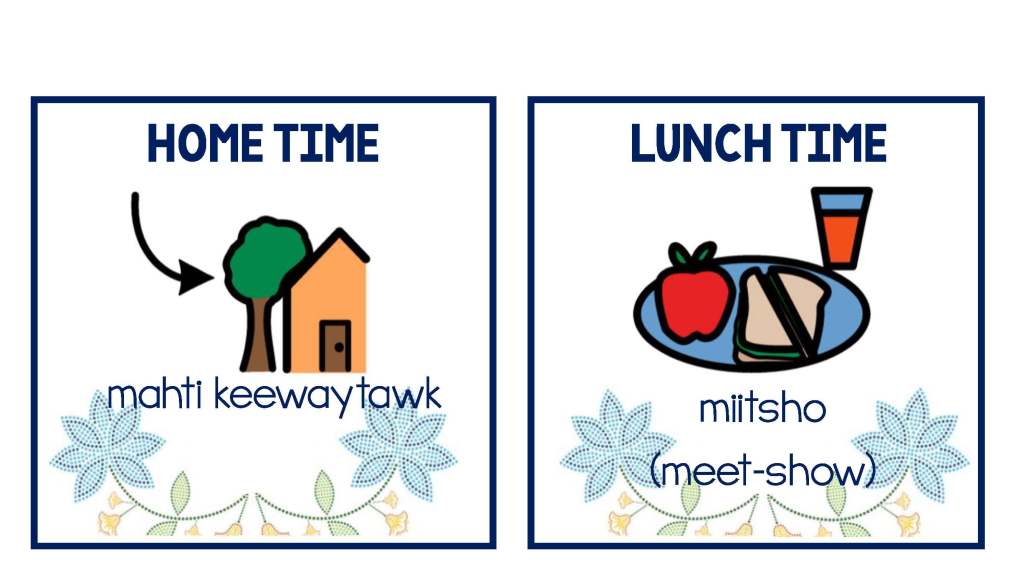Additionally, we utilize a visual schedule so I worked with two different language keepers to translate (as best that we could) our daily activities into Michif.